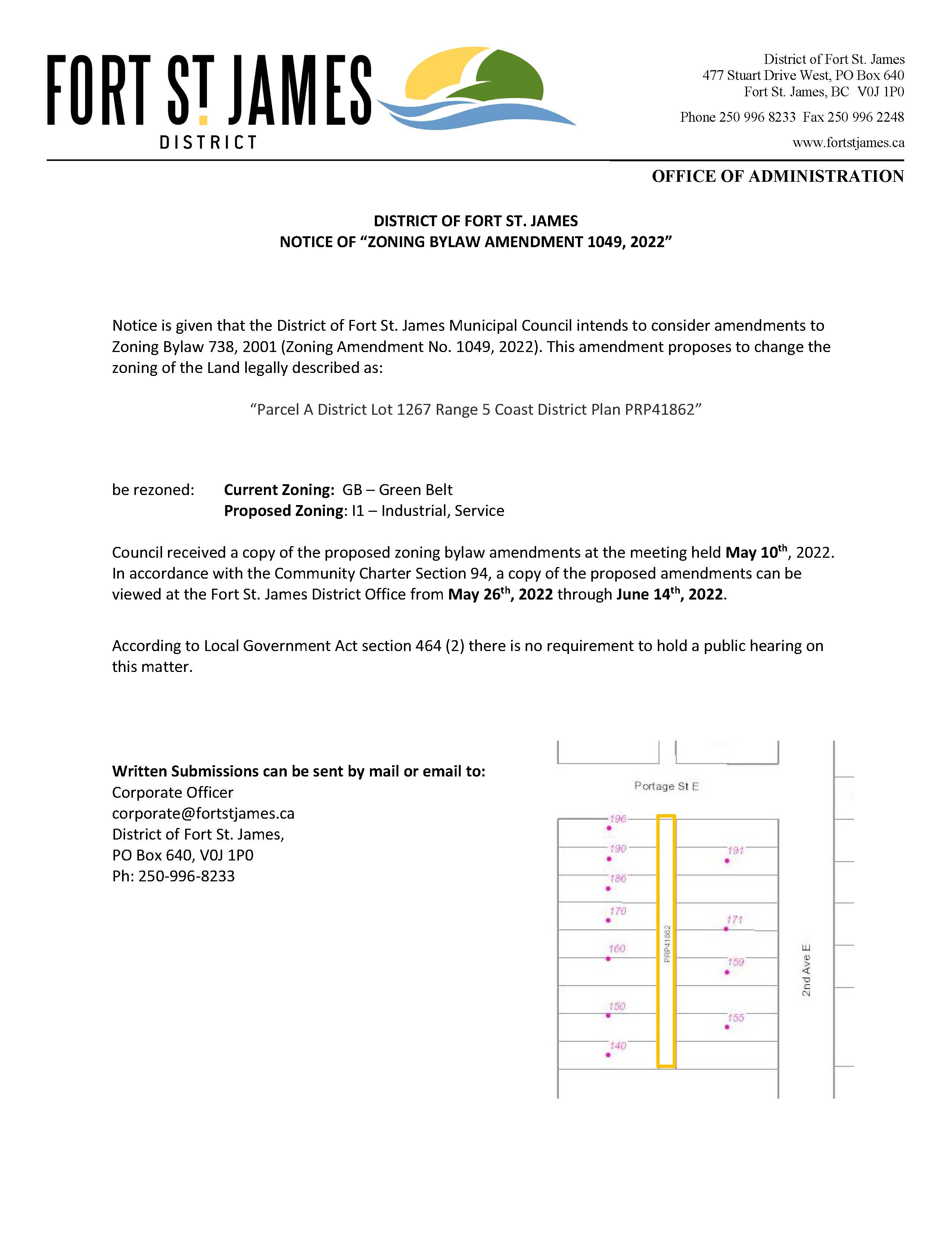 Public Notice Zoning amendment Bylaw 1049, 2022