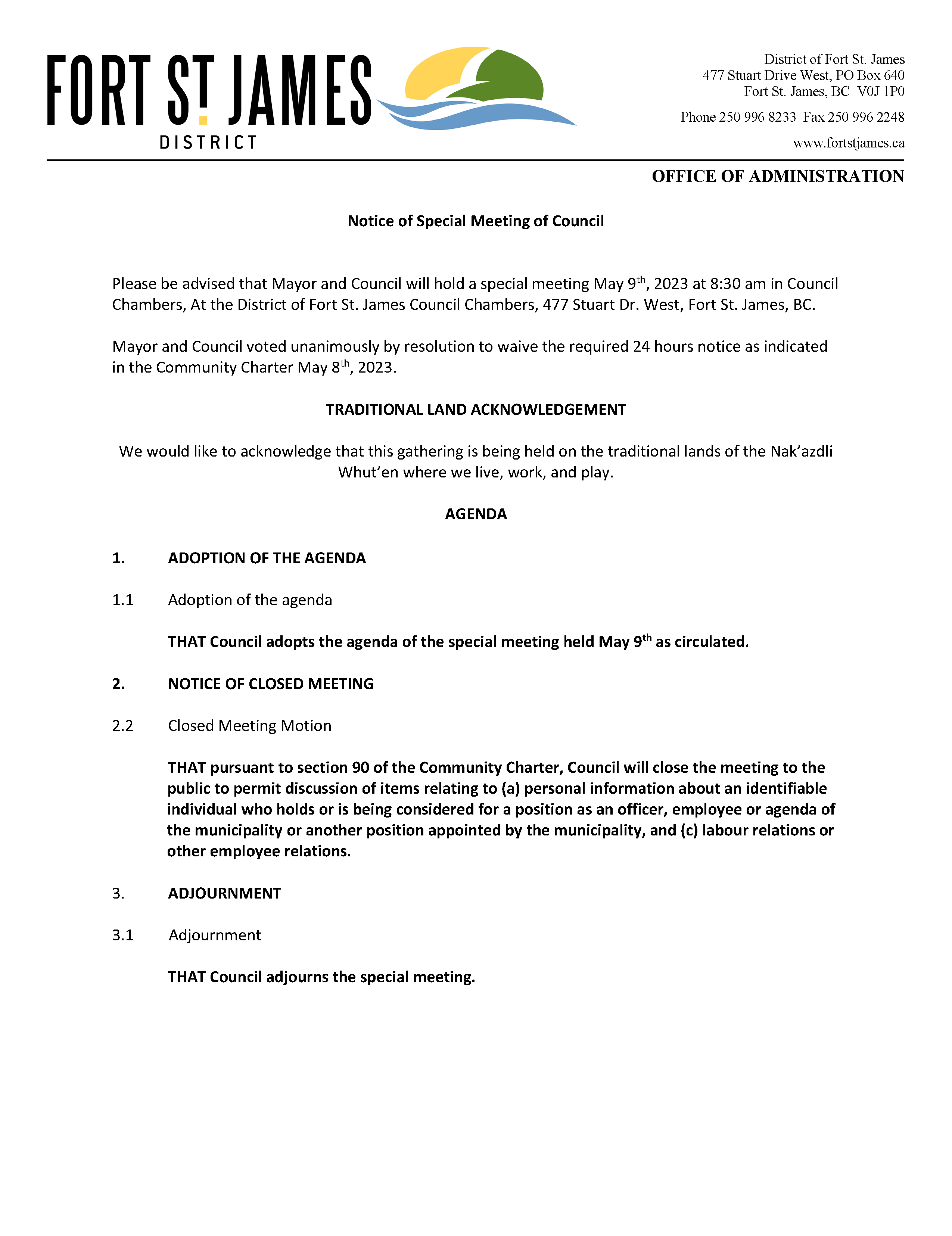 Special Meeting of Council to be held May 9th 8:30am